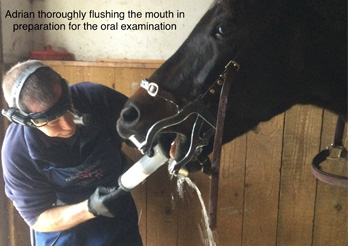 - We will then move onto the teeth themselves. First checking the incisors (front teeth) before placing the speculum on to the horses head to hold the horses mouth open, this allows us to examine the horses mouth and teeth accurately. We will flush the oral cavity thoroughly and use a light source so that we can examine, in detail, the molar arcades. We will use mirrors, picks and probes as and when necessary.