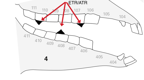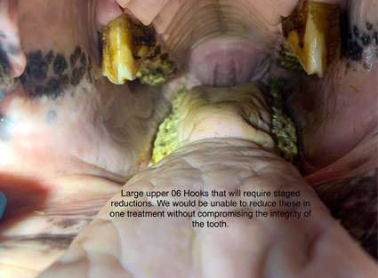 displaced teeth and focal overgrowths such as hooks, ramps and ETR’s. Feed material will collect in these gaps and if left untreated will lead to periodontal disease (disease of the structures supporting and surrounding the teeth) which is extremely painful and will eventually lead to premature loss of affected teeth.
