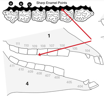 Sharp enamel points develop on the outside of the upper cheek teeth and the inside of the lower.