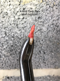 Wolf Teeth are a vestigial tooth that sit just in front of the first cheek teeth. Not to be confused with Canine teeth. They can be found on both the upper and lower jaw but are more commonly found on the upper.